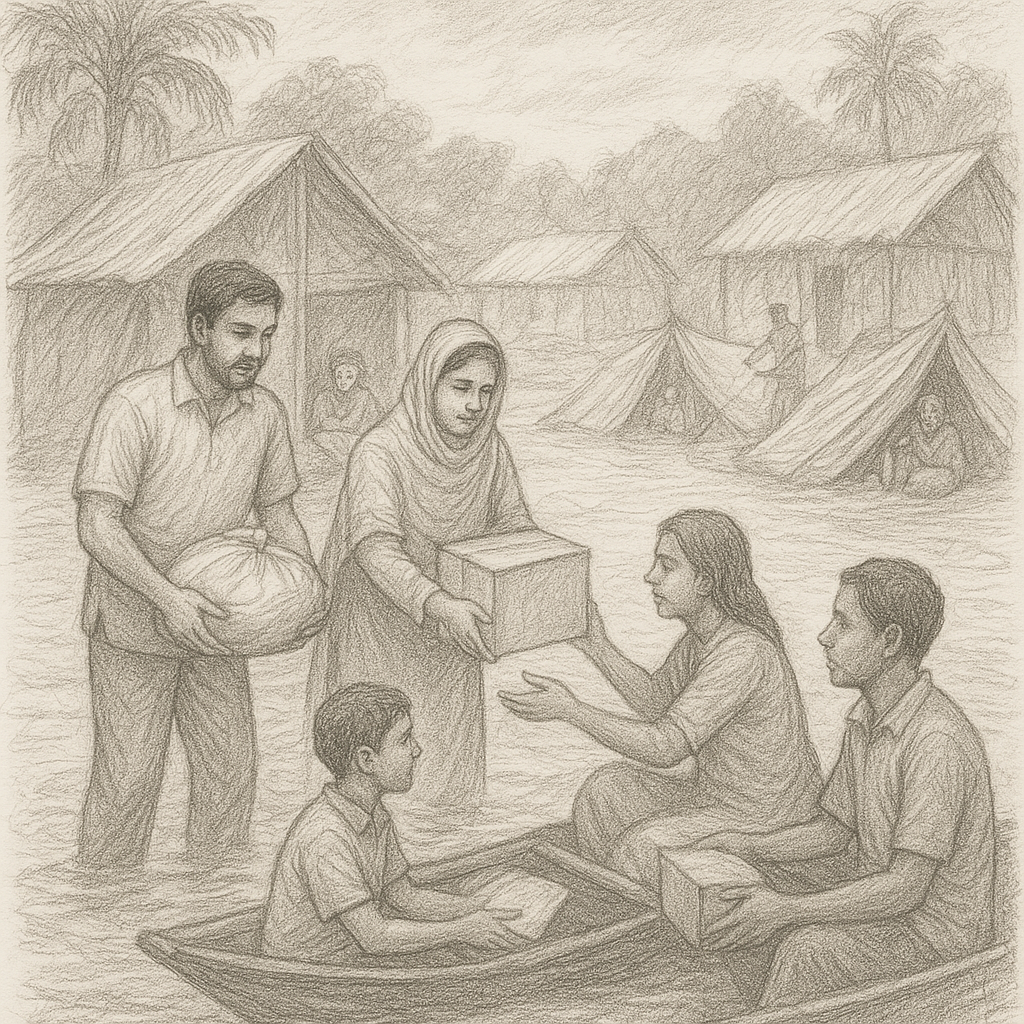 প্রাকৃতিক দুর্যোগের সময় ক্ষতিগ্রস্ত পরিবারদের জন্য জরুরি খাদ্য, ওষুধ ও ত্রাণ সহায়তা।